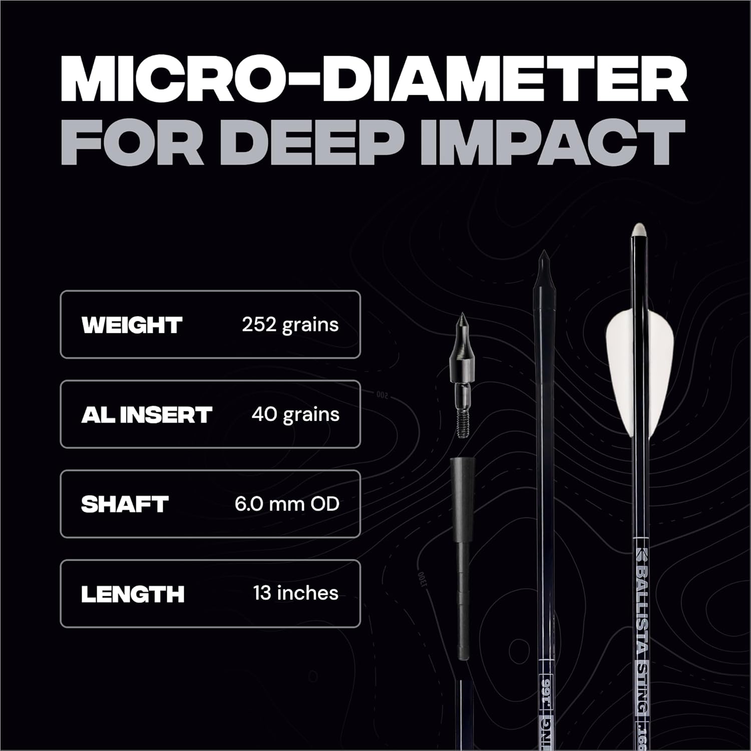 Micro-diameter Shaft with Standard Tip The Ballista Sting is the only versatile pistol crossbow carbon bolt on the market with a .236 micro-diameter shaft and standard tip. No need to compromise between speed, accuracy and penetration. Better Penetration Thanks to their micro-diameter, the Ballista Sting bolts enter the target with ease. Experiments have shown that, compared to standard diameter (.300), micro-diameter shafts increase penetration by up to 25%! Use with Any Tips The only micro-diameter bolts in the world that you can use with any tips. You have the full freedom to customize. Practice & Hunt Penetrator insert at the wide part comes in a standard size, which allows for any broadhead to be used. Reduced Wind Drift Micro-diameter shaft significantly reduces the effect of wind and other factors during the arrow’s flight. Therefore, you increase the arrow’s stability in the flight and, as a result, the accuracy of the shot. Bolt Weight Adjustment You can replace the original aluminum insert adapter with a copper or stainless steel one to increase the bolt’s weight. Fast Speed All bolts naturally slow down as they move forward because of the friction of the air they are passing through. Micro-diameter bolts maintain their speed better during descent. For crossbow hunting, arrow speed is one of the key factors. Don't Slash it... Drill it Placing more mass on the front of the arrow (F.O.C.-Front-of-Center) and the rigidity of the Bad Boys improves the flight of the arrow with a “quiter” and consistent shot