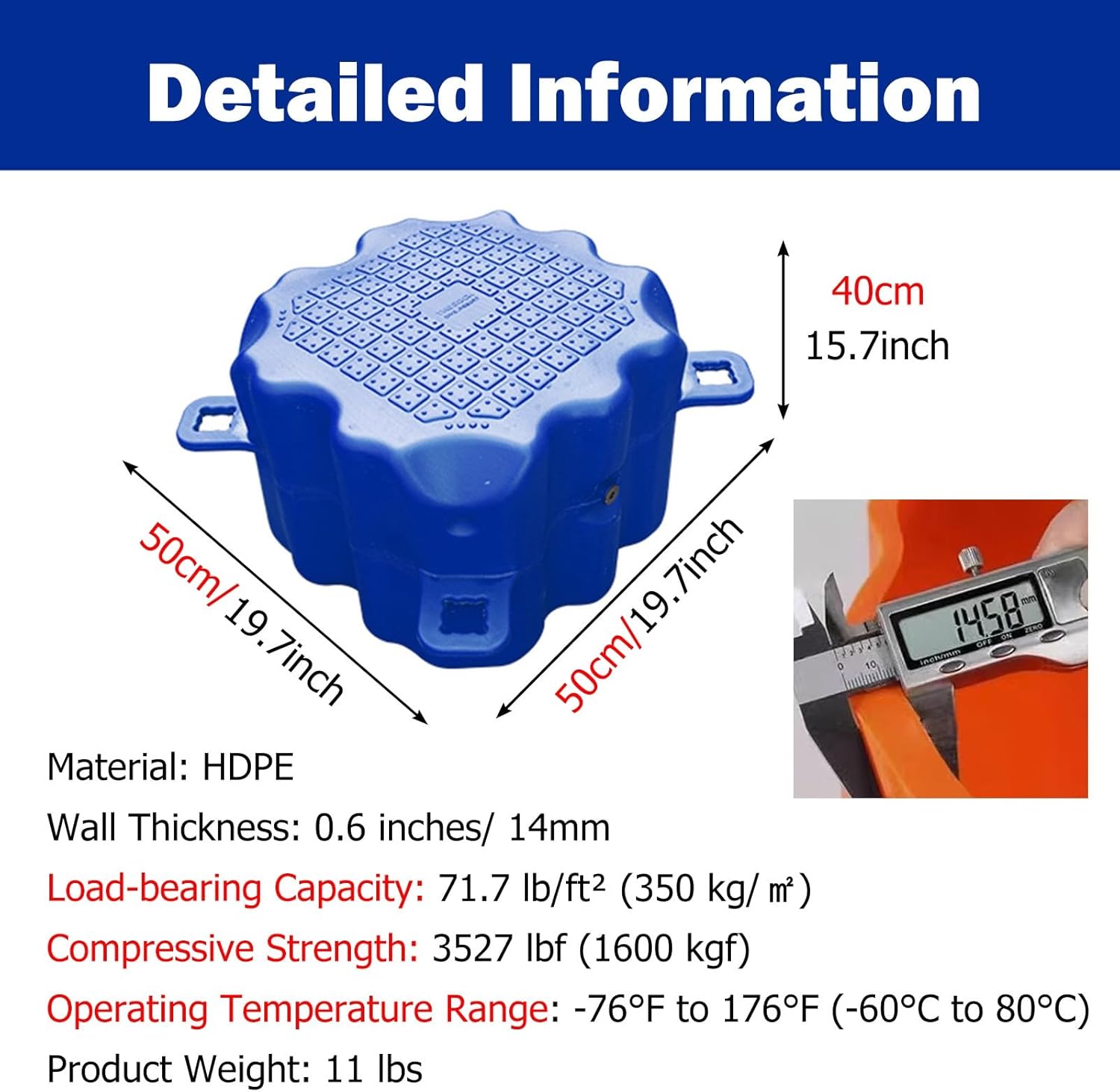 Description:-- HDPE floating docks, from fishing platforms to yacht marinas, modular assembly allows for customization of water space.Features:-- Is the floating bridge safe in extreme weather conditions?They can be used in temperatures ranging from -76°F to 176°F (-60°C to 80°C), making them suitable for long-term outdoor use.-- How should they be maintained after use?No special maintenance is required on a daily basis; simply clean the surface of debris periodically.-- What is the load-bearing capacity of a single float? Can it withstand wind and wave impacts?A float measuring 19.7 x 19.7 x 15.7 inches has a load-bearing capacity of approximately 1,600 kgf. When assembled, it can withstand a weight of 61.5 lb per square foot (300 kg/㎡) and resist the impact of 3-4 level wind and wave conditions.-- How are these floats assembled into large floating bridges or platforms?Through modular design, float drums/cylinders can be quickly assembled using connectors (such as bolts or clips) to form linear, U-shaped, square, or other layouts. Specifications:-- Material: HDPE -- Wall Thickness: 0.6 inches /14mm -- Load-bearing Capacity: 61.5 lb/ft² (300 kg/㎡) -- Compressive Strength: 3527 lbf (1600 kgf)-- Operating temperature range: -76°F to 176°F (-60°C to 80°C) -- Product weight: 11 lbs/ 5 kgPackage Includes:-- 1 × Fishing PlatformNote:-- Because it is processed by hand, the finished product usually has an error of 1-2 cm, please understand.-- Due to differences in some monitors and lighting reasons, there may be a slight color difference between pictures and objects.