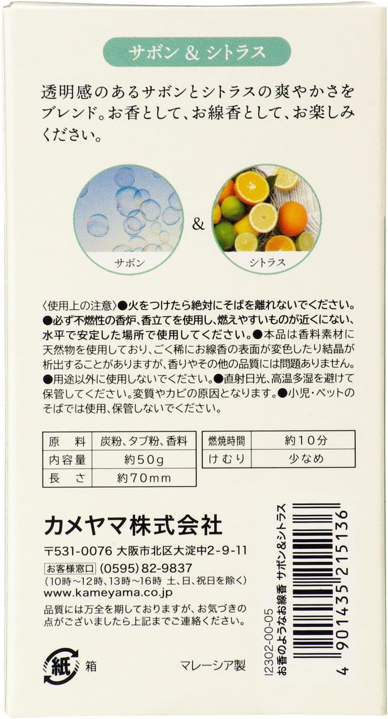 ● Enjoy the fragrance more freely by exceeding the "frame" of incense and sticks. ● Incense sticks have been decided to be used for accompaniments. This "Incense Incense Incense" is a revolutionary product that allows Kameama to remove the hedges of incense and incense, and as an incense stick, it is a high quality altar, and it can be used as a room fragrance for your living room as you like. A refreshing blend of sabon and citrus with a sense of transparency.